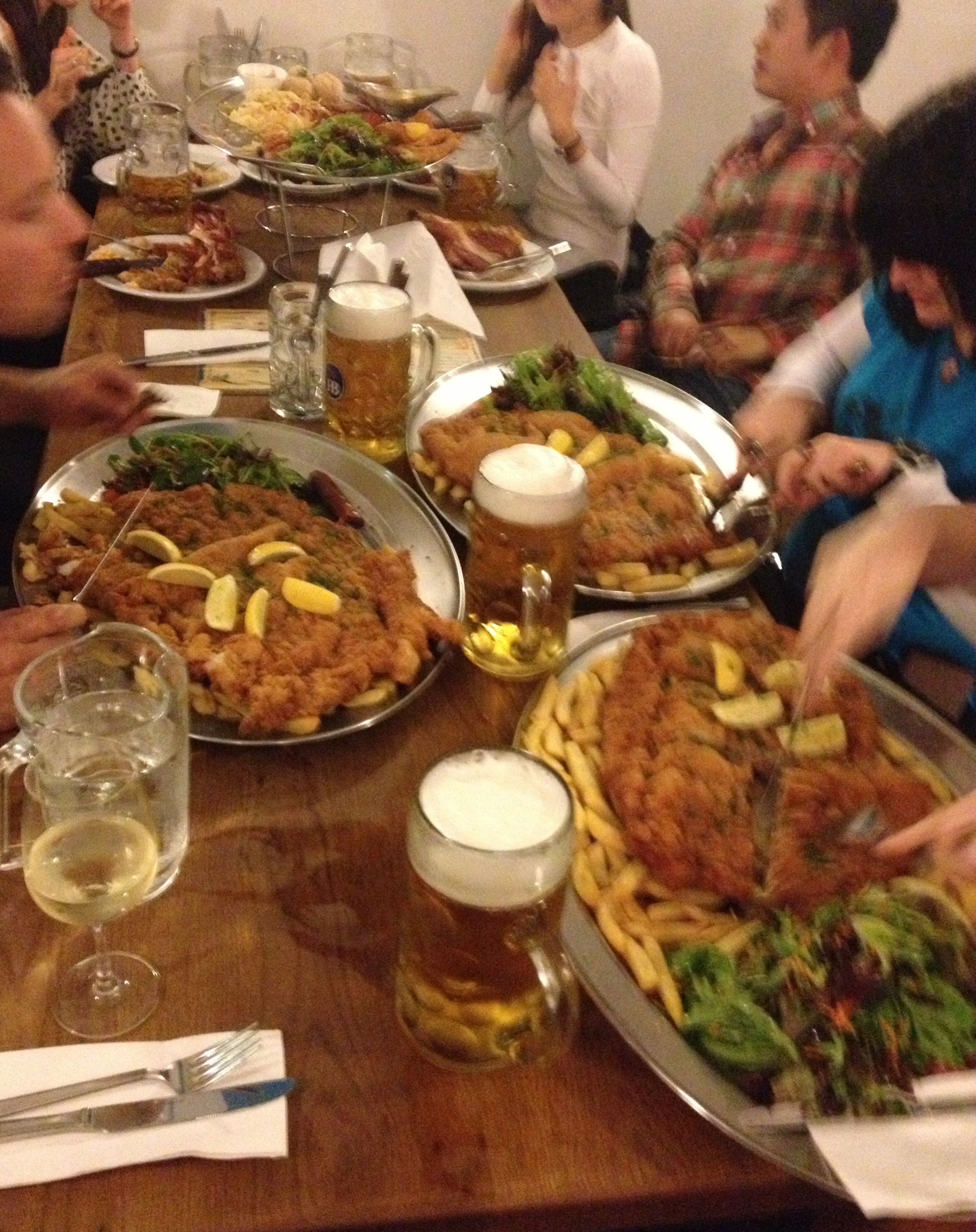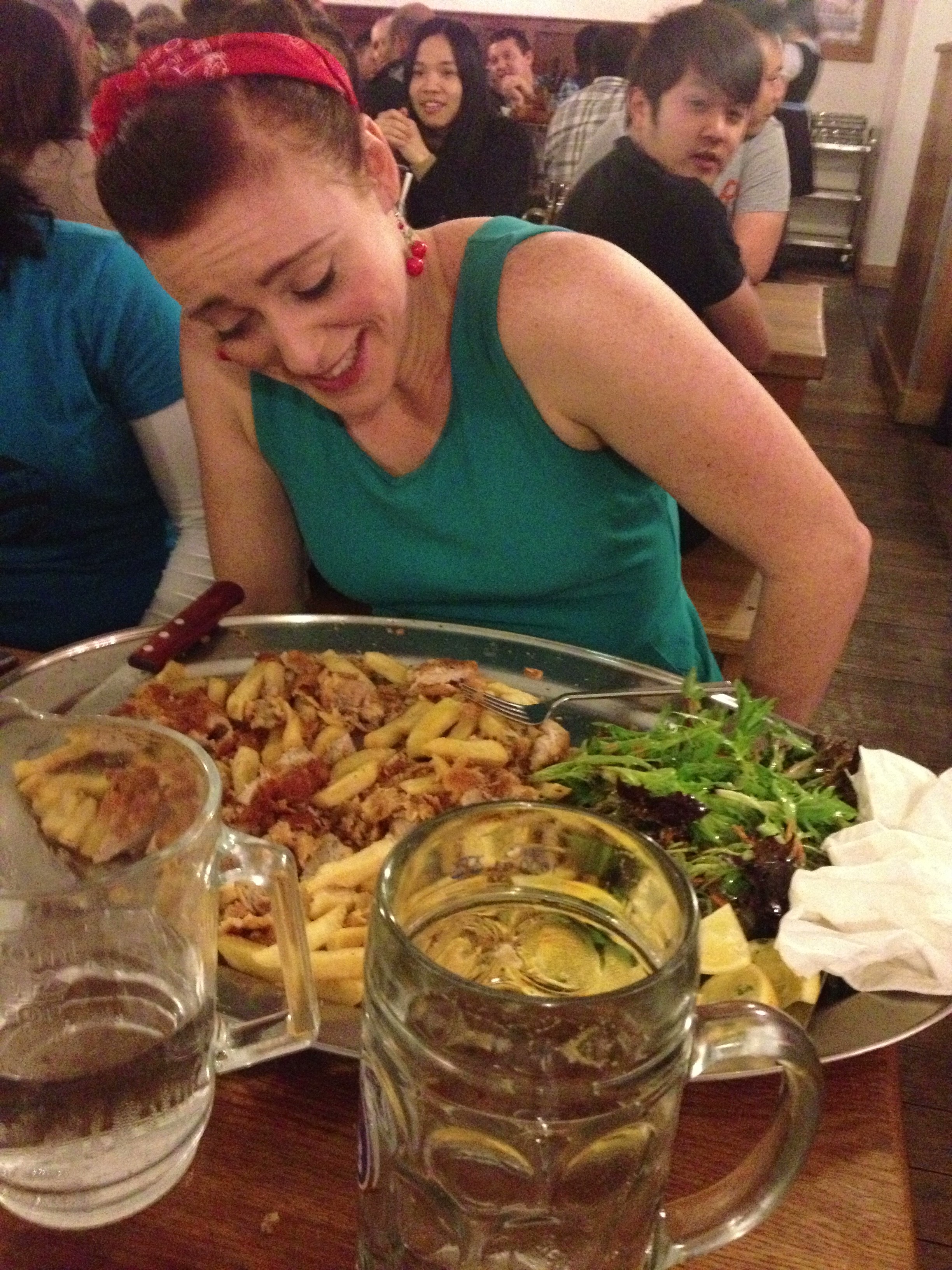 By the time we were seated at 6pm to take on the challenge I felt like I could eat a baby giraffe, and the huge plates travelling past our table with the scent of roast meat and Germanic goodness were making us all drool like Pavlov’s dogs.