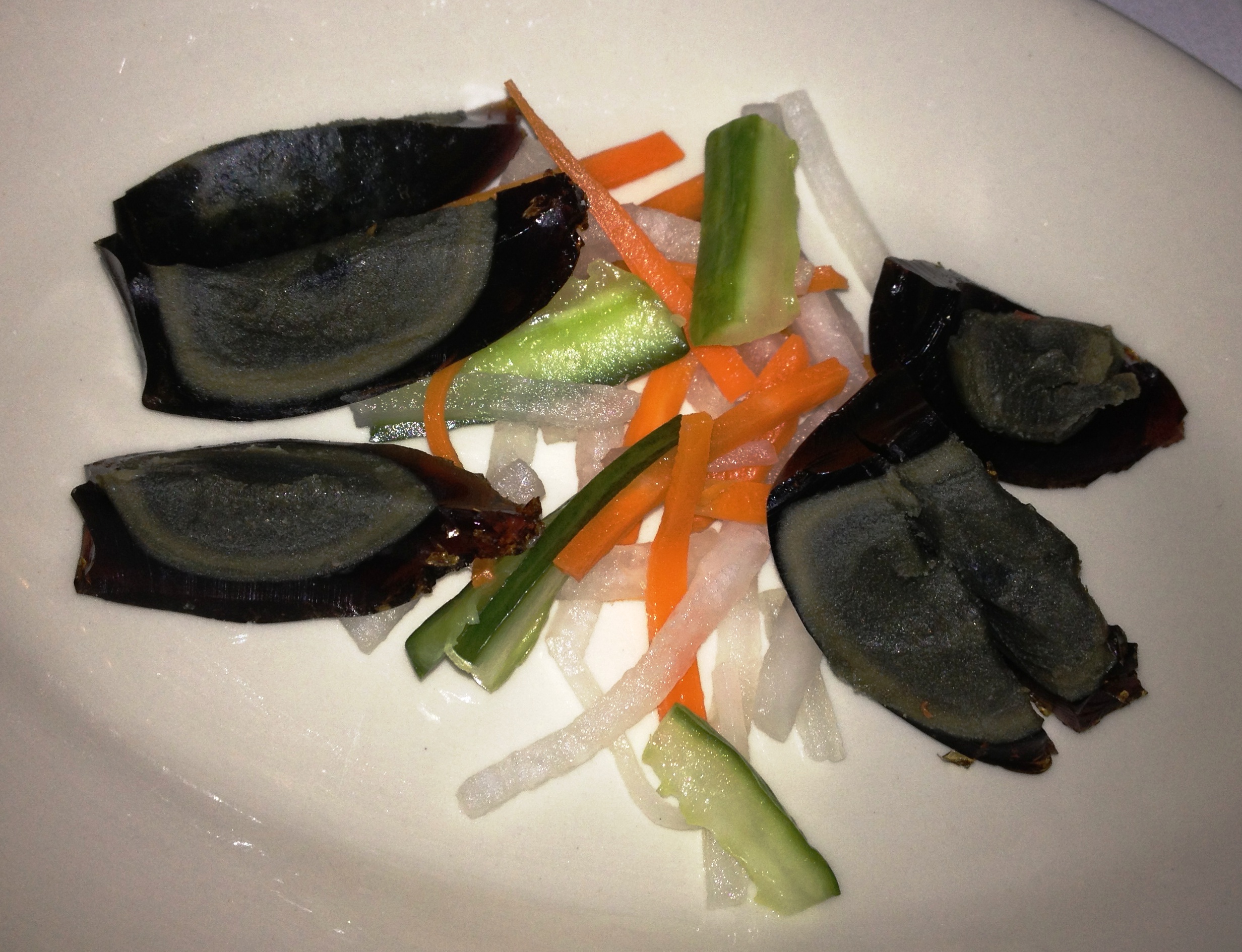When a reader challenged me to try out the fearsome “Century Egg” (AKA Preserved egg, one-hundred year egg, millennium egg etc etc etc), a quick Google conjured up images of jelly like, black, amber and green icky looking egg touted to “smell like sulphur and ammonia.”