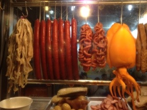 Across the road you could see the uncooked intestines of duck (reminding us what we had just consumed), orange squid like things, pig intestines and Chinese sausages amongst other things like squab, chicken and goose.