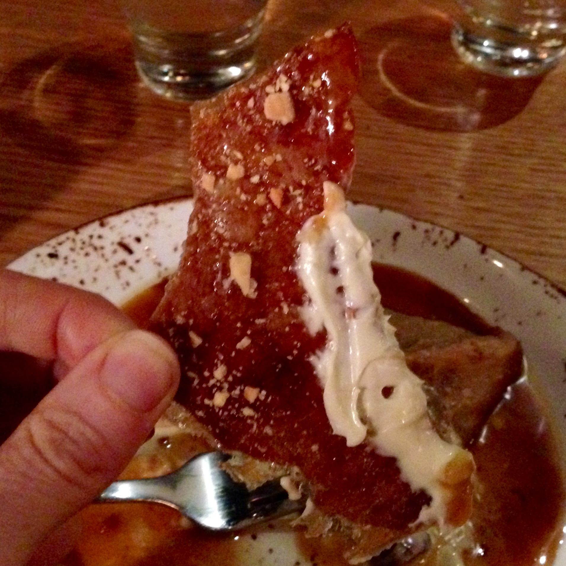 It was served with a wafer of something resembling fried skin, which we were to guess it’s origin. In keeping with the night’s theme I suggested that perhaps it was pig uterus lining, but the table were determined that it was either some kind of foreskin or genital skin. Read aforementioned comment on how many beers had been consumed ;).
