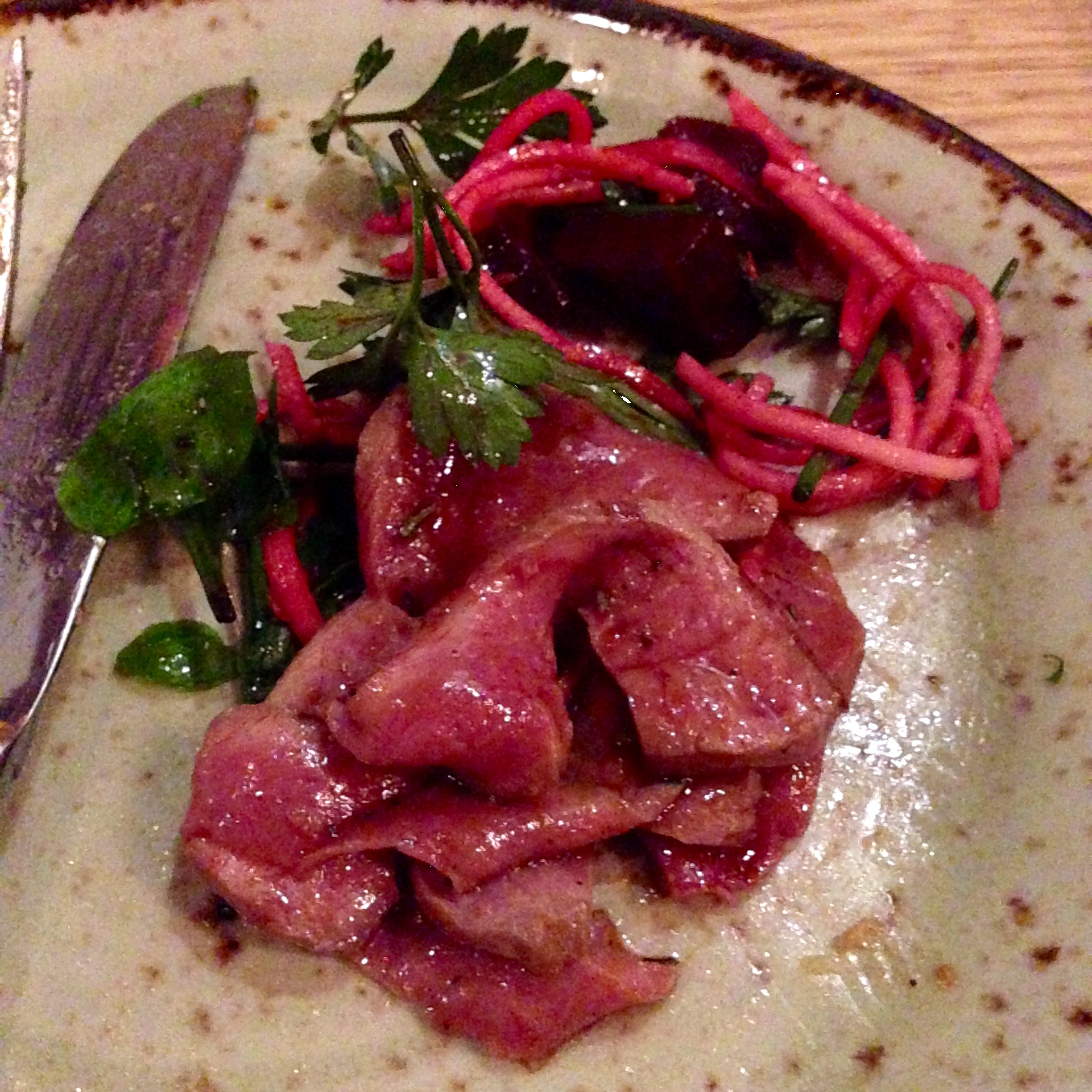 The surprise dish of the four was the Ox Heart. I’d never tried heart from such a large animal before, having had chicken countless times. I guess I’d expected something spongy and chewy. Instead the dish was like a rare, tender steak. Not chewy but with a bit of bounce and no lingering aftertaste which was excellent washed down with a blonde beer. You could fool many people into eating heart serving something so delicately presented atop a fresh salad.
