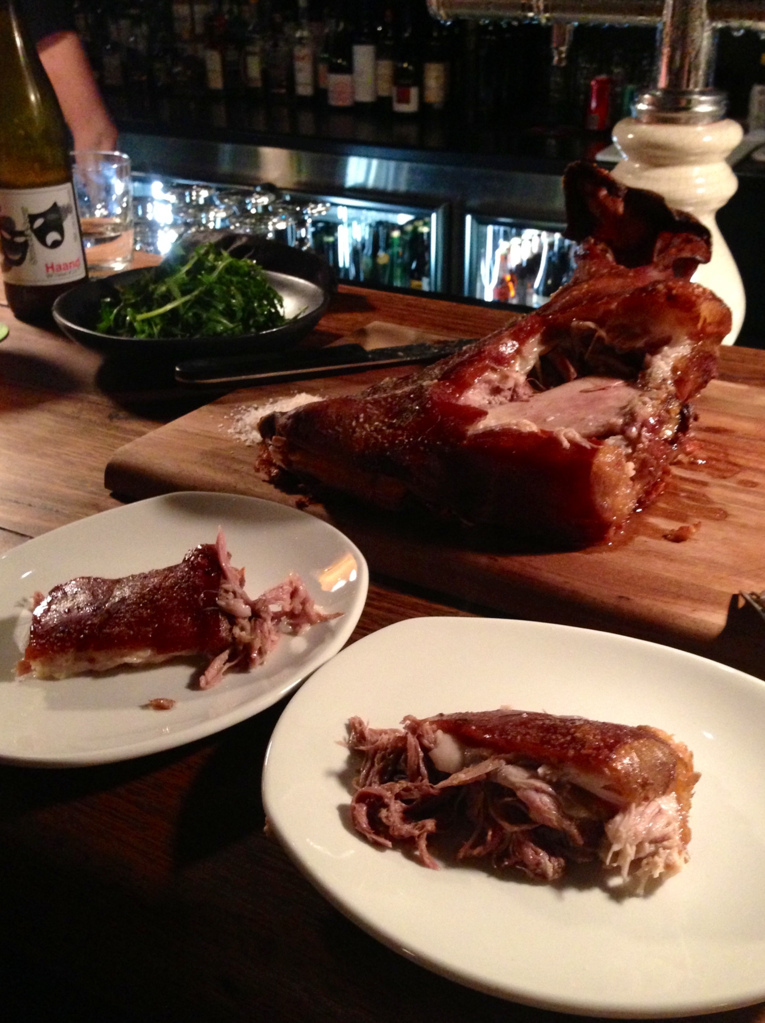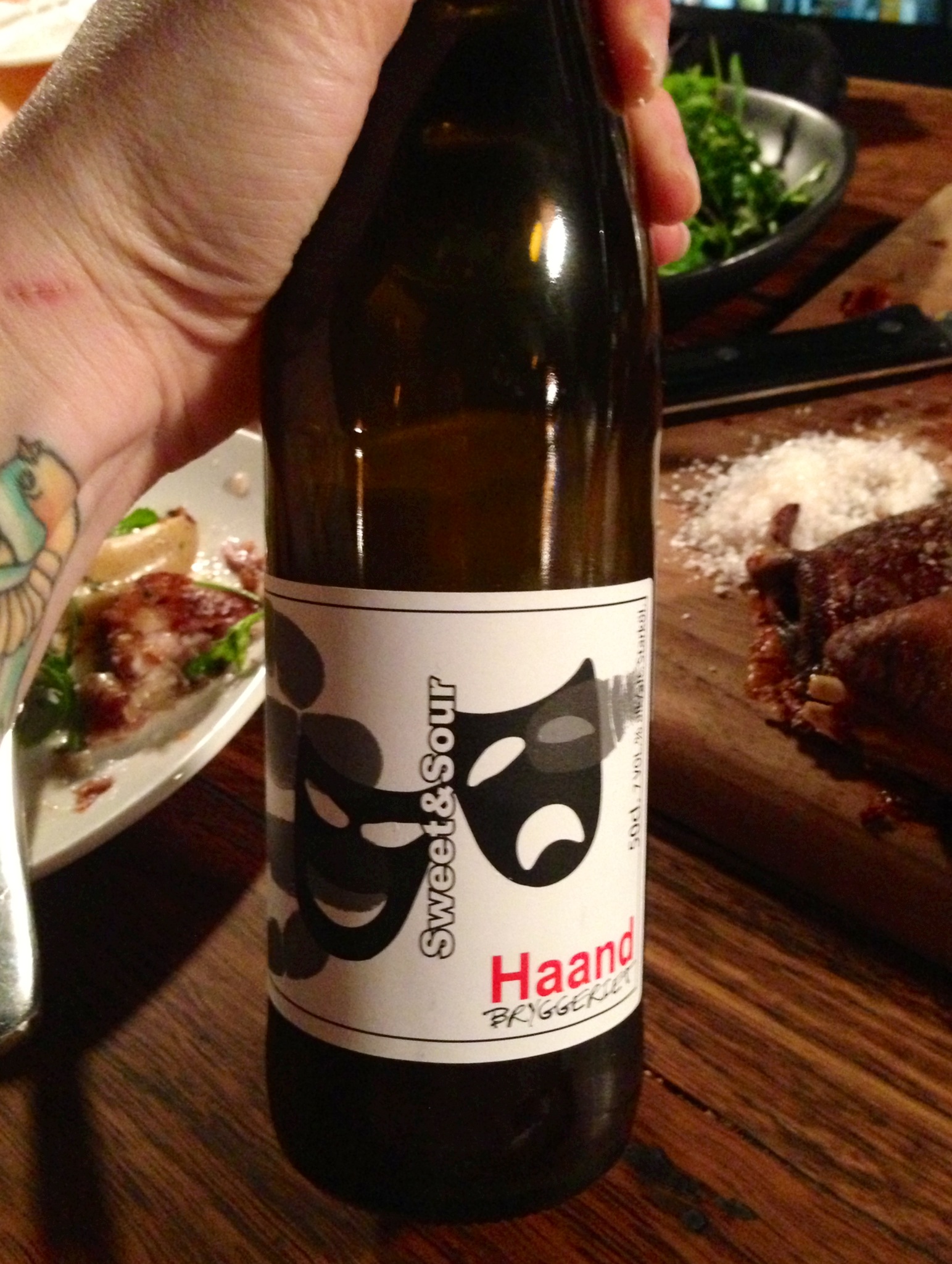 The Kipfler potatoes on the side and seasoned rocket were mostly ignored amongst the mountain of pork, however it was nice to munch on something else to break the flavour up at points. We were recommended to try a certain beer with the pork, a sweet and sour beer called HaandBryggeriet. Whilst I understand the concept of the sweet and sour matching well with the pork, it didn’t quite do it for me. It’s a VERY strong-tasting beer that leaves a rather strong aftertaste which coupled with salty pork has more flavour overload than an original sour warhead. A pint of apple cider however… magic!
